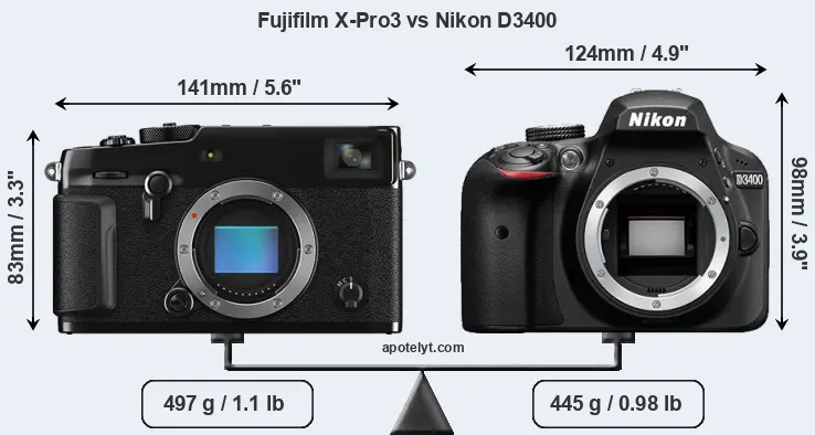 If the front view area (width x height) of the cameras is taken as an aggregate measure of their size, the Nikon D3400 is somewhat larger (4 percent) than the Fujifilm X-Pro3. However, the D3400 is markedly lighter (10 percent) than the X-Pro3. It is worth mentioning in this context that the X-Pro3 is splash and dust resistant, while the D3400 does not feature any corresponding weather-sealing.