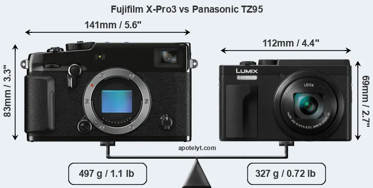 If the front view area (width x height) of the cameras is taken as an aggregate measure of their size, the Panasonic TZ95 is considerably smaller (34 percent) than the Fujifilm X-Pro3. It is worth mentioning in this context that the X-Pro3 is splash and dust resistant, while the TZ95 does not feature any corresponding weather-sealing.