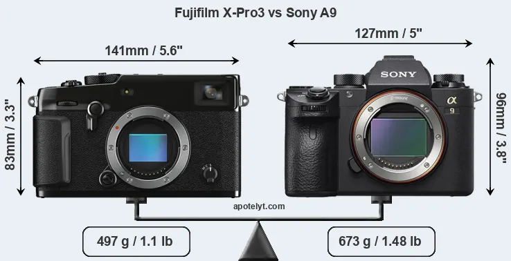 If the front view area (width x height) of the cameras is taken as an aggregate measure of their size, the Sony A9 is somewhat larger (4 percent) than the Fujifilm X-Pro3. Moreover, the A9 is substantially heavier (35 percent) than the X-Pro3. In this context, it is worth noting that both cameras are splash and dust-proof and can, hence, be used in inclement weather conditions or harsh environments.