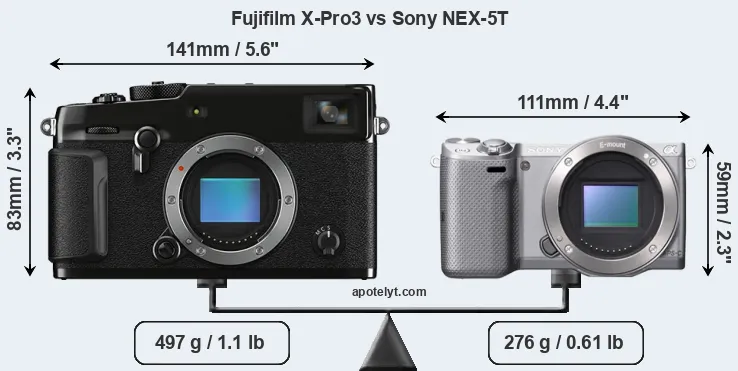 An illustration of the physical size and weight of the Fujifilm X-Pro3 and the Sony NEX-5T is provided in the side-by-side display below. The two cameras are presented according to their relative size. Three consecutive views from the front, the top, and the rear side are shown. All width, height and depth measures are rounded to the nearest millimeter.