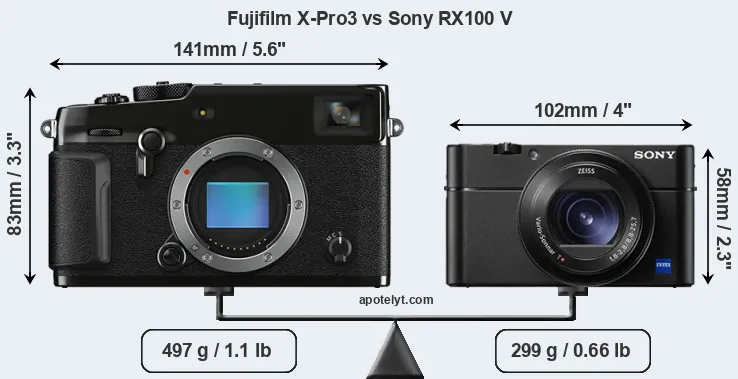 The physical size and weight of the Fujifilm X-Pro3 and the Sony RX100 V are illustrated in the side-by-side display below. The two cameras are presented according to their relative size. Three successive views from the front, the top, and the rear are shown. All width, height and depth dimensions are rounded to the nearest millimeter.