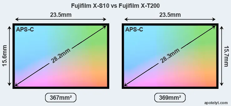 Both cameras under consideration feature an APS-C sensor, but their sensors differ slightly in size. The sensor area in the X-T200 is 1 percent bigger. They nevertheless have the same format factor of 1.5. Both cameras have a native aspect ratio (sensor width to sensor height) of 3:2.