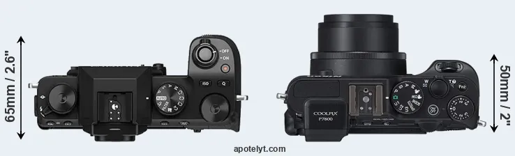 The physical size and weight of the Fujifilm X-S10 and the Nikon P7800 are illustrated in the side-by-side display below. The two cameras are presented according to their relative size. Three consecutive views from the front, the top, and the rear side are shown. All size dimensions are rounded to the nearest millimeter.