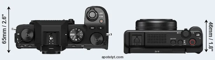 The physical size and weight of the Fujifilm X-S10 and the Sony ZV-1F are illustrated in the side-by-side display below. The two cameras are presented according to their relative size. Three consecutive perspectives from the front, the top, and the back are available. All size dimensions are rounded to the nearest millimeter.