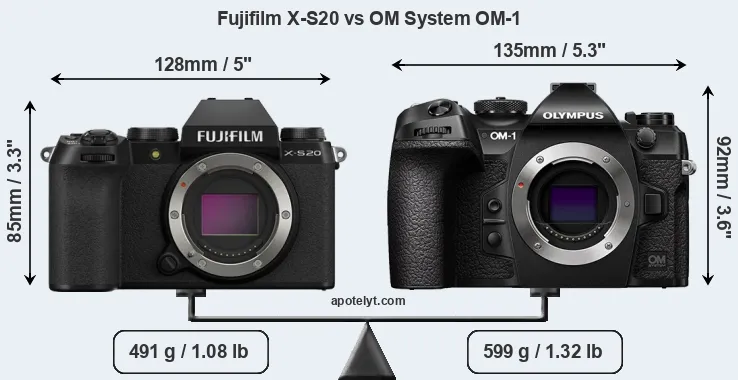 If the front view area (width x height) of the cameras is taken as an aggregate measure of their size, the OM System OM-1 is notably larger (14 percent) than the Fujifilm X-S20. Moreover, the OM-1 is markedly heavier (22 percent) than the X-S20. It is noteworthy in this context that the OM-1 is splash and dust-proof, while the X-S20 does not feature any corresponding weather-sealing.