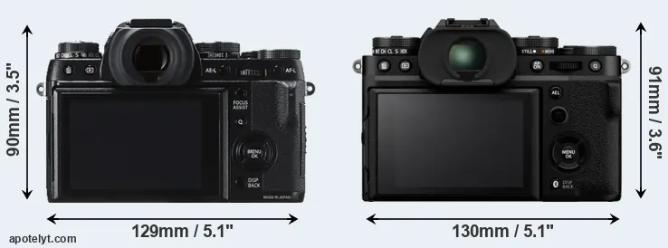 If the front view area (width x height) of the cameras is taken as an aggregate measure of their size, the Fujifilm X-T5 is somewhat larger (2 percent) than the Fujifilm X-T1. Moreover, the X-T5 is markedly heavier (27 percent) than the X-T1. In this context, it is worth noting that both cameras are splash and dust-proof and can, hence, be used in inclement weather conditions or harsh environments.