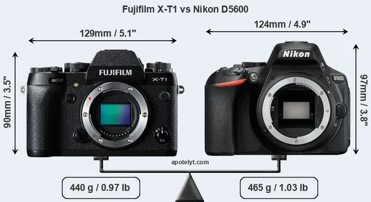 The side-by-side display below illustrates the physical size and weight of the Fujifilm X-T1 and the Nikon D5600. The two cameras are presented according to their relative size. Three successive views from the front, the top, and the rear are shown. All width, height and depth measures are rounded to the nearest millimeter.