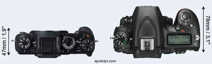 An illustration of the physical size and weight of the Fujifilm X-T1 and the Nikon D750 is provided in the side-by-side display below. The two cameras are presented according to their relative size. Three consecutive perspectives from the front, the top, and the back are available. All size dimensions are rounded to the nearest millimeter.