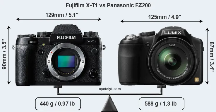 The side-by-side display below illustrates the physical size and weight of the Fujifilm X-T1 and the Panasonic FZ200. The two cameras are presented according to their relative size. Three successive views from the front, the top, and the rear are shown. All width, height and depth dimensions are rounded to the nearest millimeter.