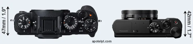 The side-by-side display below illustrates the physical size and weight of the Fujifilm X-T1 and the Panasonic LX15. The two cameras are presented according to their relative size. Three consecutive perspectives from the front, the top, and the back are available. All width, height and depth measures are rounded to the nearest millimeter.