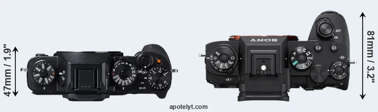 The physical size and weight of the Fujifilm X-T1 and the Sony A1 are illustrated in the side-by-side display below. The two cameras are presented according to their relative size. Three consecutive perspectives from the front, the top, and the back are available. All width, height and depth measures are rounded to the nearest millimeter.