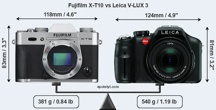 The side-by-side display below illustrates the physical size and weight of the Fujifilm X-T10 and the Leica V-LUX 3. The two cameras are presented according to their relative size. Three consecutive views from the front, the top, and the rear side are shown. All width, height and depth dimensions are rounded to the nearest millimeter.