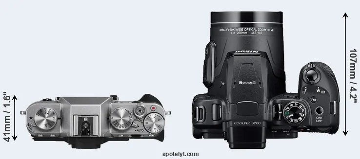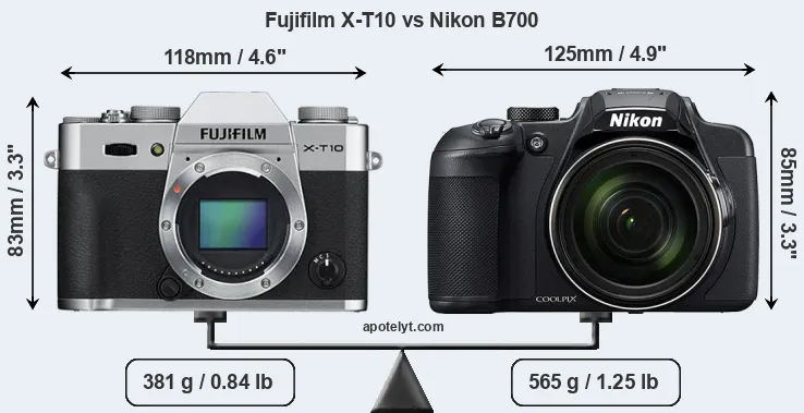 An illustration of the physical size and weight of the Fujifilm X-T10 and the Nikon B700 is provided in the side-by-side display below. The two cameras are presented according to their relative size. Three consecutive perspectives from the front, the top, and the back are available. All size dimensions are rounded to the nearest millimeter.
