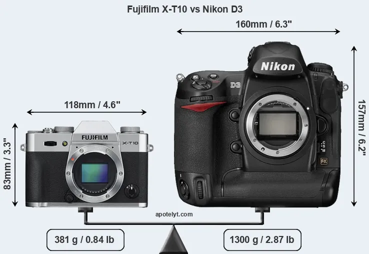 If the front view area (width x height) of the cameras is taken as an aggregate measure of their size, the Nikon D3 is considerably larger (156 percent) than the Fujifilm X-T10. Moreover, the D3 is substantially heavier (241 percent) than the X-T10. It is noteworthy in this context that the D3 is splash and dust-proof, while the X-T10 does not feature any corresponding weather-sealing.