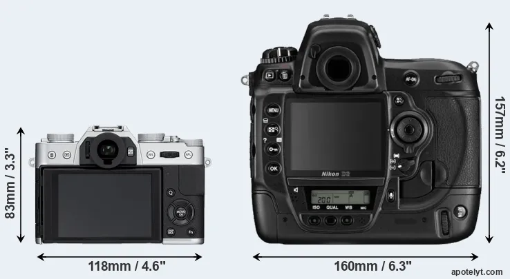 An illustration of the physical size and weight of the Fujifilm X-T10 and the Nikon D3 is provided in the side-by-side display below. The two cameras are presented according to their relative size. Three consecutive perspectives from the front, the top, and the back are available. All width, height and depth dimensions are rounded to the nearest millimeter.