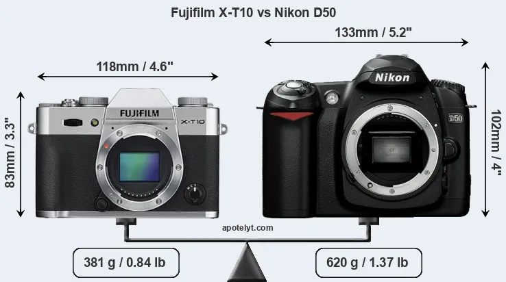 The side-by-side display below illustrates the physical size and weight of the Fujifilm X-T10 and the Nikon D50. The two cameras are presented according to their relative size. Three consecutive perspectives from the front, the top, and the back are available. All width, height and depth dimensions are rounded to the nearest millimeter.