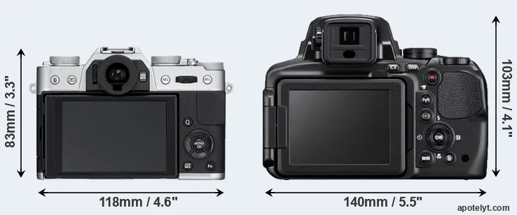 The above size and weight comparisons are to some extent incomplete and possibly misleading, as the P900 has a lens built in, whereas the X-T10 is an interchangeable lens camera that requires a separate lens. Attaching the latter will add extra weight and bulk to the setup. You can compare the optics available for the X-T10 and their specifications in the Fujinon X Lens Catalog.