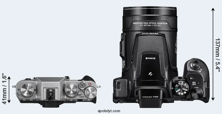 The side-by-side display below illustrates the physical size and weight of the Fujifilm X-T10 and the Nikon P900. The two cameras are presented according to their relative size. Three consecutive perspectives from the front, the top, and the back are available. All size dimensions are rounded to the nearest millimeter.