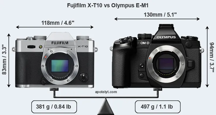 If the front view area (width x height) of the cameras is taken as an aggregate measure of their size, the Olympus E-M1 is notably larger (25 percent) than the Fujifilm X-T10. Moreover, the E-M1 is markedly heavier (30 percent) than the X-T10. It is noteworthy in this context that the E-M1 is splash and dust-proof, while the X-T10 does not feature any corresponding weather-sealing.