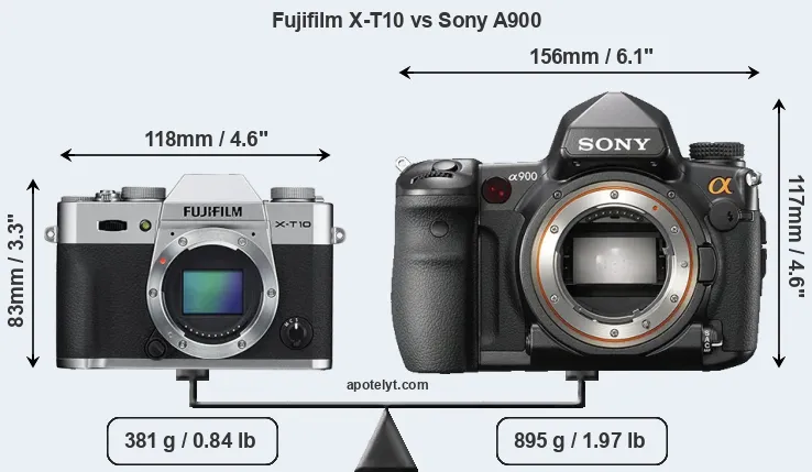 If the front view area (width x height) of the cameras is taken as an aggregate measure of their size, the Sony A900 is considerably larger (86 percent) than the Fujifilm X-T10. Moreover, the A900 is substantially heavier (135 percent) than the X-T10. It is noteworthy in this context that the A900 is splash and dust-proof, while the X-T10 does not feature any corresponding weather-sealing.