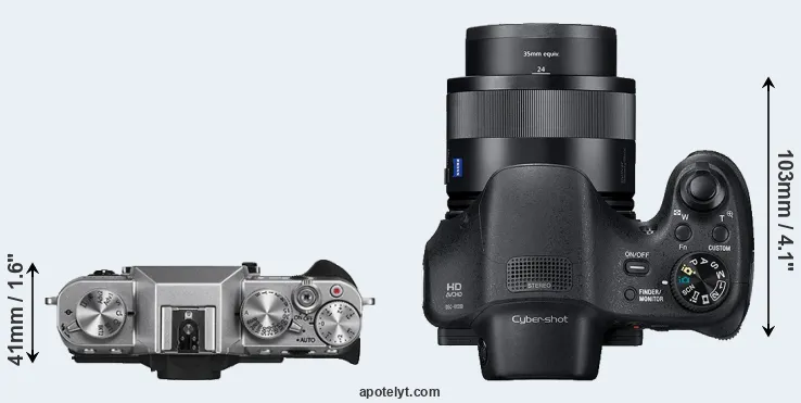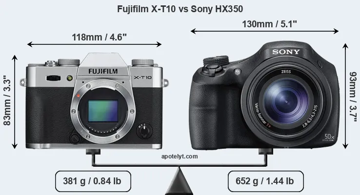 The side-by-side display below illustrates the physical size and weight of the Fujifilm X-T10 and the Sony HX350. The two cameras are presented according to their relative size. Three successive views from the front, the top, and the rear are shown. All width, height and depth measures are rounded to the nearest millimeter.