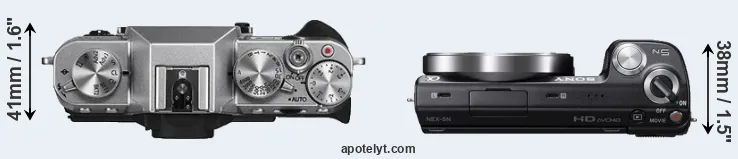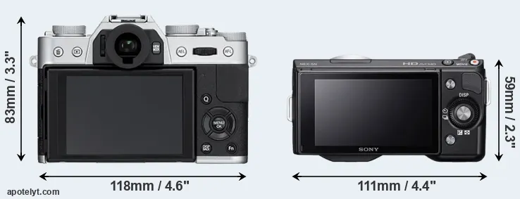 The side-by-side display below illustrates the physical size and weight of the Fujifilm X-T10 and the Sony NEX-5N. The two cameras are presented according to their relative size. Three consecutive perspectives from the front, the top, and the back are available. All width, height and depth dimensions are rounded to the nearest millimeter.