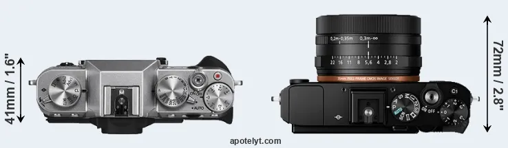 The physical size and weight of the Fujifilm X-T10 and the Sony RX1R II are illustrated in the side-by-side display below. The two cameras are presented according to their relative size. Three consecutive views from the front, the top, and the rear side are shown. All size dimensions are rounded to the nearest millimeter.