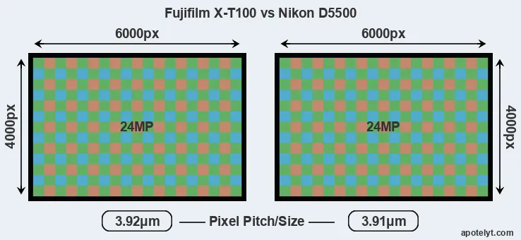 | Sensor Specs | Fujifilm X-T100 | Nikon D5500 |