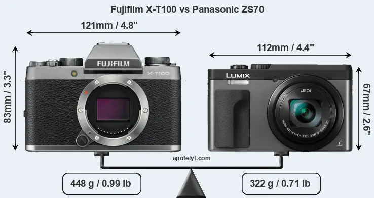 The physical size and weight of the Fujifilm X-T100 and the Panasonic ZS70 are illustrated in the side-by-side display below. The two cameras are presented according to their relative size. Three consecutive perspectives from the front, the top, and the back are available. All size dimensions are rounded to the nearest millimeter.