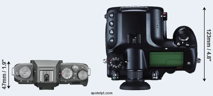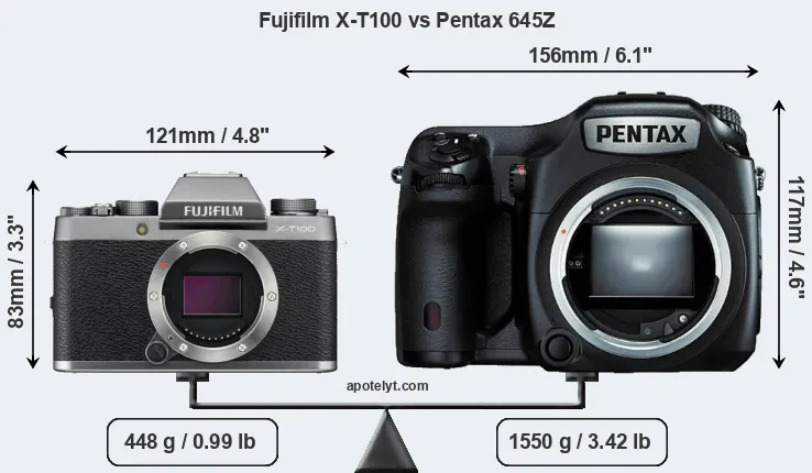 The physical size and weight of the Fujifilm X-T100 and the Pentax 645Z are illustrated in the side-by-side display below. The two cameras are presented according to their relative size. Three consecutive perspectives from the front, the top, and the back are available. All width, height and depth dimensions are rounded to the nearest millimeter.