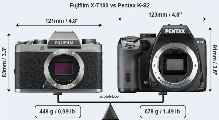 If the front view area (width x height) of the cameras is taken as an aggregate measure of their size, the Pentax K-S2 is notably larger (11 percent) than the Fujifilm X-T100. Moreover, the K-S2 is substantially heavier (51 percent) than the X-T100. It is noteworthy in this context that the K-S2 is splash and dust-proof, while the X-T100 does not feature any corresponding weather-sealing.