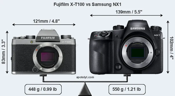 If the front view area (width x height) of the cameras is taken as an aggregate measure of their size, the Samsung NX1 is notably larger (41 percent) than the Fujifilm X-T100. Moreover, the NX1 is markedly heavier (23 percent) than the X-T100. It is noteworthy in this context that the NX1 is splash and dust-proof, while the X-T100 does not feature any corresponding weather-sealing.