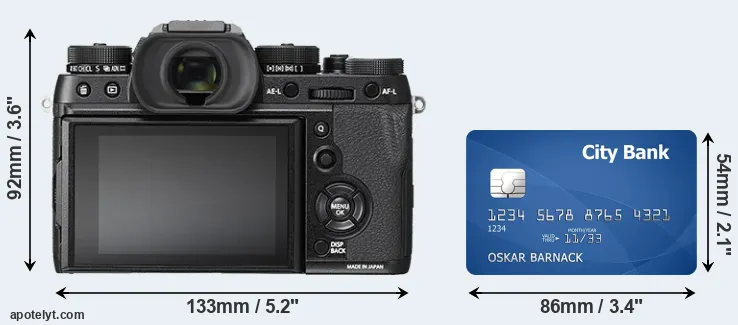 An illustration of the physical dimensions of the Fujifilm X-T2 vis-à-vis a credit card is provided in the side-by-side display below. Three consecutive perspectives from the front, the top, and the back are presented. All size dimensions are rounded to the nearest millimeter.