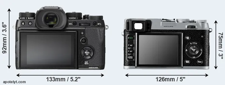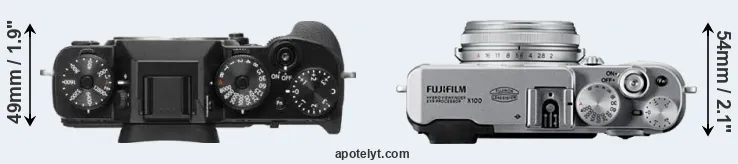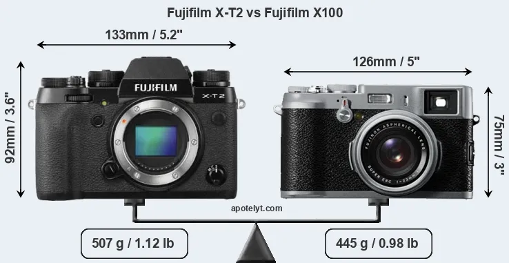 The side-by-side display below illustrates the physical size and weight of the Fujifilm X-T2 and the Fujifilm X100. The two cameras are presented according to their relative size. Three consecutive views from the front, the top, and the rear side are shown. All width, height and depth measures are rounded to the nearest millimeter.