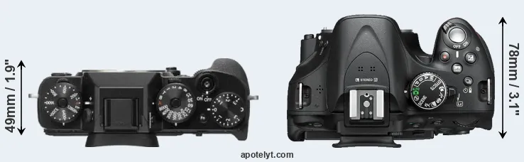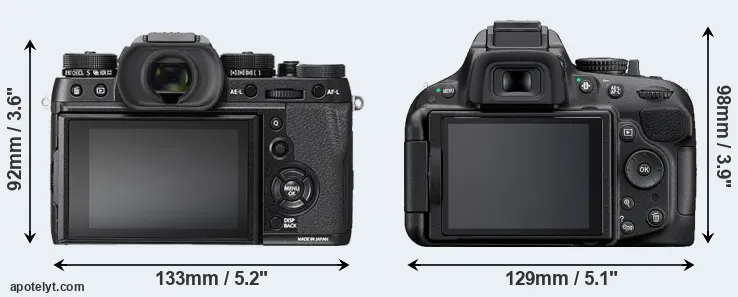The side-by-side display below illustrates the physical size and weight of the Fujifilm X-T2 and the Nikon D5200. The two cameras are presented according to their relative size. Three consecutive perspectives from the front, the top, and the back are available. All size dimensions are rounded to the nearest millimeter.