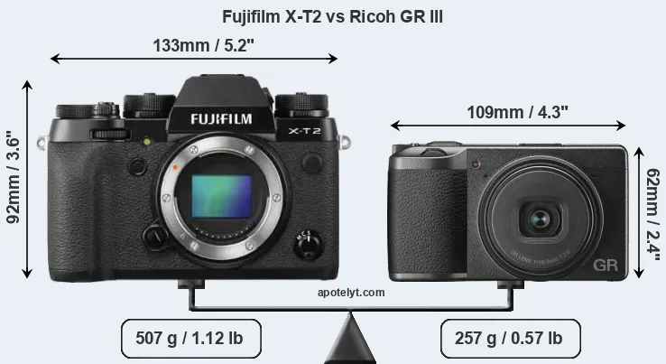 The physical size and weight of the Fujifilm X-T2 and the Ricoh GR III are illustrated in the side-by-side display below. The two cameras are presented according to their relative size. Three consecutive perspectives from the front, the top, and the back are available. All width, height and depth dimensions are rounded to the nearest millimeter.