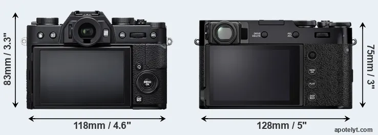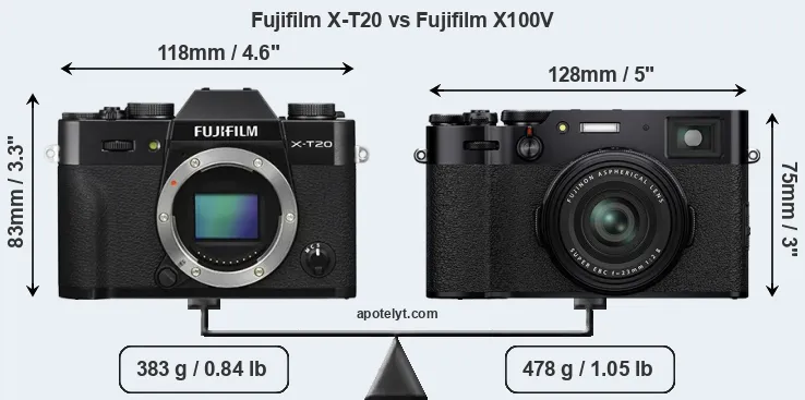 The physical size and weight of the Fujifilm X-T20 and the Fujifilm X100V are illustrated in the side-by-side display below. The two cameras are presented according to their relative size. Three successive views from the front, the top, and the rear are shown. All width, height and depth measures are rounded to the nearest millimeter.