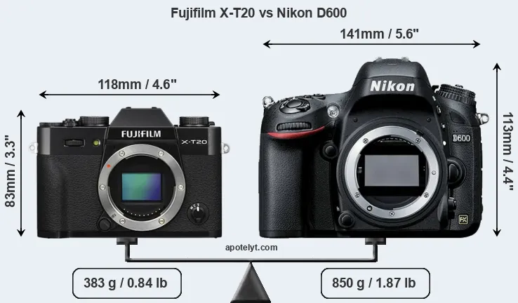 If the front view area (width x height) of the cameras is taken as an aggregate measure of their size, the Nikon D600 is considerably larger (63 percent) than the Fujifilm X-T20. Moreover, the D600 is substantially heavier (122 percent) than the X-T20. It is noteworthy in this context that the D600 is splash and dust-proof, while the X-T20 does not feature any corresponding weather-sealing.