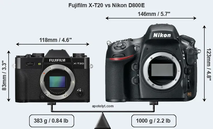 If the front view area (width x height) of the cameras is taken as an aggregate measure of their size, the Nikon D800E is considerably larger (83 percent) than the Fujifilm X-T20. Moreover, the D800E is substantially heavier (161 percent) than the X-T20. It is noteworthy in this context that the D800E is splash and dust-proof, while the X-T20 does not feature any corresponding weather-sealing.