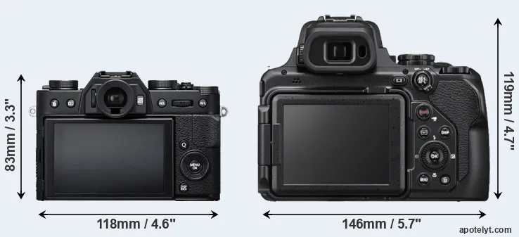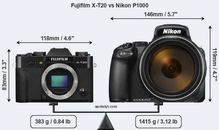 The above size and weight comparisons are to some extent incomplete and possibly misleading, as the P1000 has a lens built in, whereas the X-T20 is an interchangeable lens camera that requires a separate lens. Attaching the latter will add extra weight and bulk to the setup. You can compare the optics available for the X-T20 and their specifications in the Fujinon X Lens Catalog.