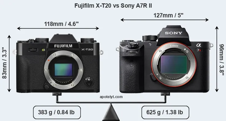 If the front view area (width x height) of the cameras is taken as an aggregate measure of their size, the Sony A7R II is notably larger (24 percent) than the Fujifilm X-T20. Moreover, the A7R II is substantially heavier (63 percent) than the X-T20. It is noteworthy in this context that the A7R II is splash and dust-proof, while the X-T20 does not feature any corresponding weather-sealing.
