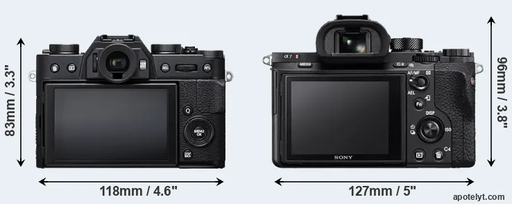 An illustration of the physical size and weight of the Fujifilm X-T20 and the Sony A7R II is provided in the side-by-side display below. The two cameras are presented according to their relative size. Three successive views from the front, the top, and the rear are shown. All width, height and depth dimensions are rounded to the nearest millimeter.