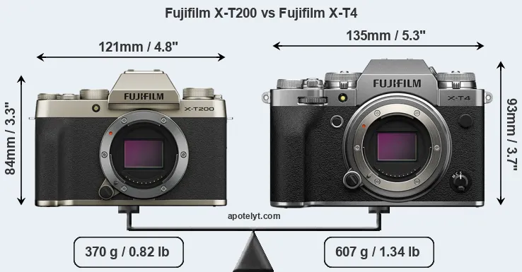 The side-by-side display below illustrates the physical size and weight of the Fujifilm X-T200 and the Fujifilm X-T4. The two cameras are presented according to their relative size. Three consecutive perspectives from the front, the top, and the back are available. All width, height and depth measures are rounded to the nearest millimeter.