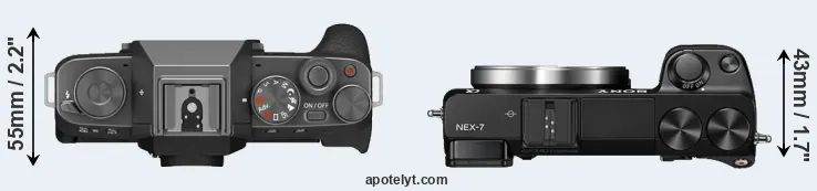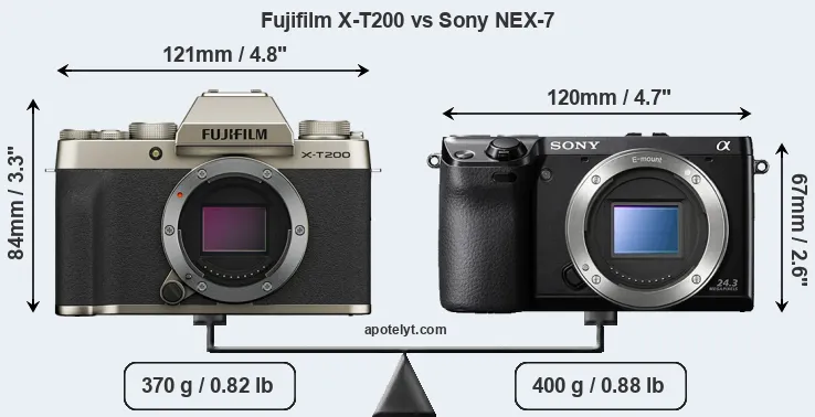 The physical size and weight of the Fujifilm X-T200 and the Sony NEX-7 are illustrated in the side-by-side display below. The two cameras are presented according to their relative size. Three consecutive perspectives from the front, the top, and the back are available. All width, height and depth dimensions are rounded to the nearest millimeter.