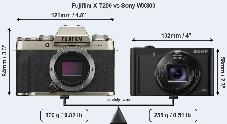 An illustration of the physical size and weight of the Fujifilm X-T200 and the Sony WX800 is provided in the side-by-side display below. The two cameras are presented according to their relative size. Three successive views from the front, the top, and the rear are shown. All size dimensions are rounded to the nearest millimeter.