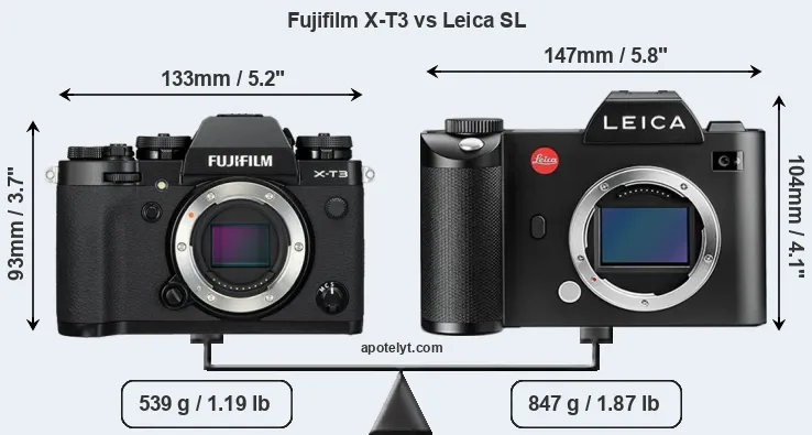 The side-by-side display below illustrates the physical size and weight of the Fujifilm X-T3 and the Leica SL. The two cameras are presented according to their relative size. Three successive views from the front, the top, and the rear are shown. All width, height and depth measures are rounded to the nearest millimeter.