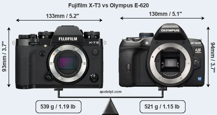 An illustration of the physical size and weight of the Fujifilm X-T3 and the Olympus E-620 is provided in the side-by-side display below. The two cameras are presented according to their relative size. Three consecutive views from the front, the top, and the rear side are shown. All width, height and depth measures are rounded to the nearest millimeter.