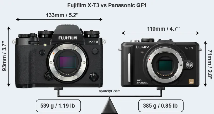If the front view area (width x height) of the cameras is taken as an aggregate measure of their size, the Panasonic GF1 is considerably smaller (32 percent) than the Fujifilm X-T3. Moreover, the GF1 is markedly lighter (29 percent) than the X-T3. It is worth mentioning in this context that the X-T3 is splash and dust resistant, while the GF1 does not feature any corresponding weather-sealing.