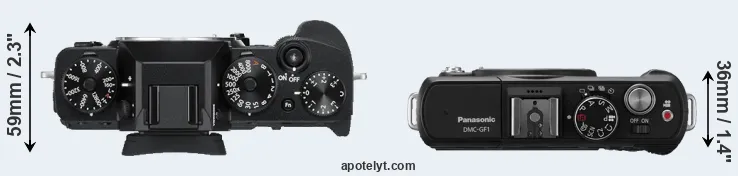The physical size and weight of the Fujifilm X-T3 and the Panasonic GF1 are illustrated in the side-by-side display below. The two cameras are presented according to their relative size. Three consecutive perspectives from the front, the top, and the back are available. All size dimensions are rounded to the nearest millimeter.