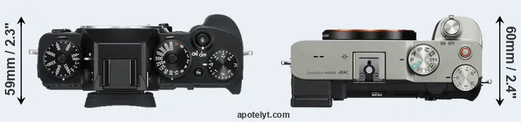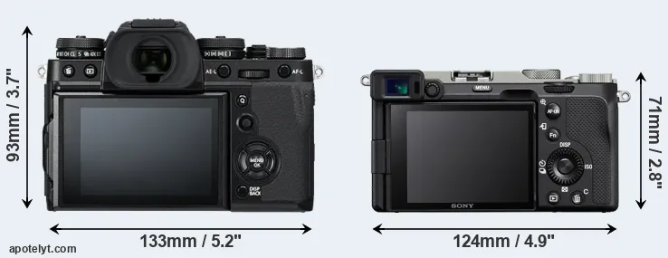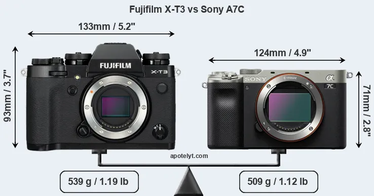 An illustration of the physical size and weight of the Fujifilm X-T3 and the Sony A7C is provided in the side-by-side display below. The two cameras are presented according to their relative size. Three consecutive perspectives from the front, the top, and the back are available. All width, height and depth dimensions are rounded to the nearest millimeter.